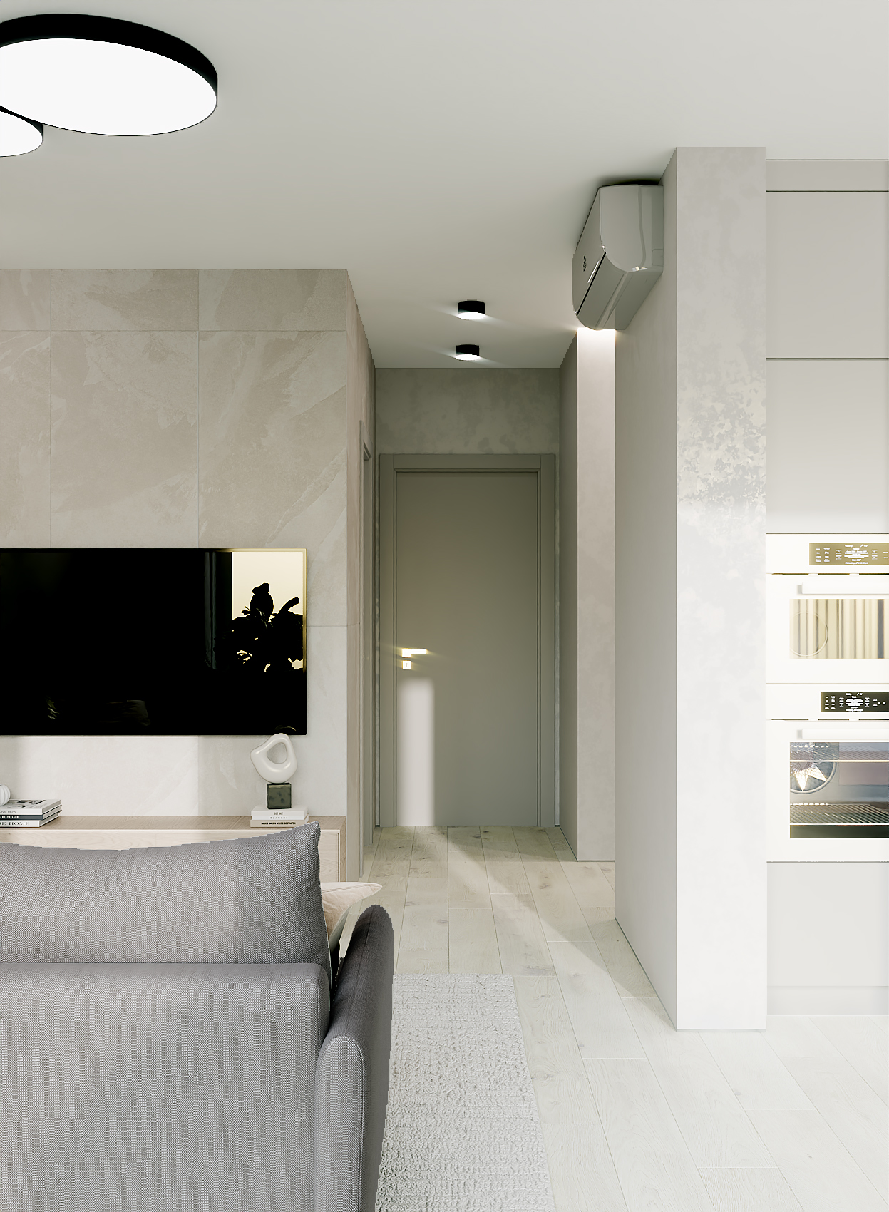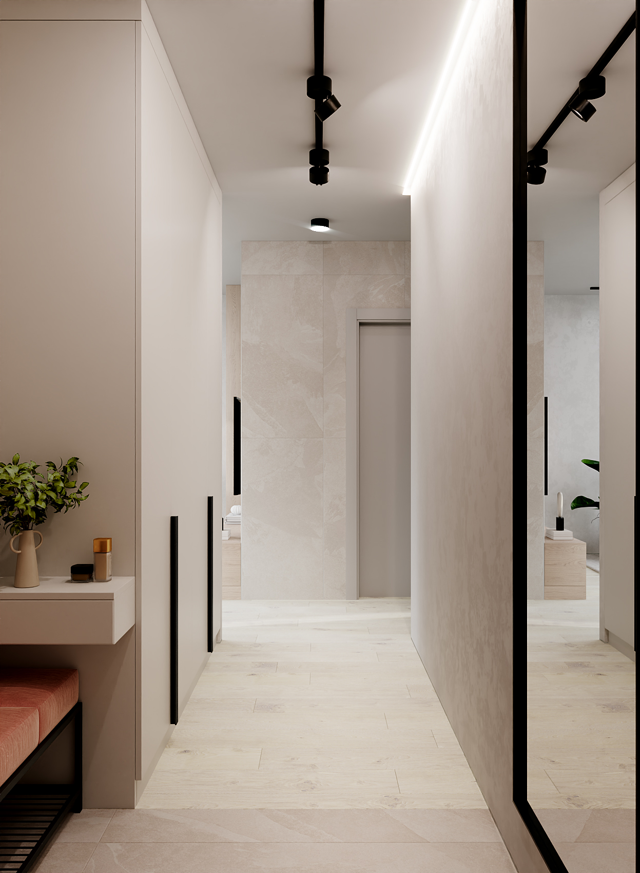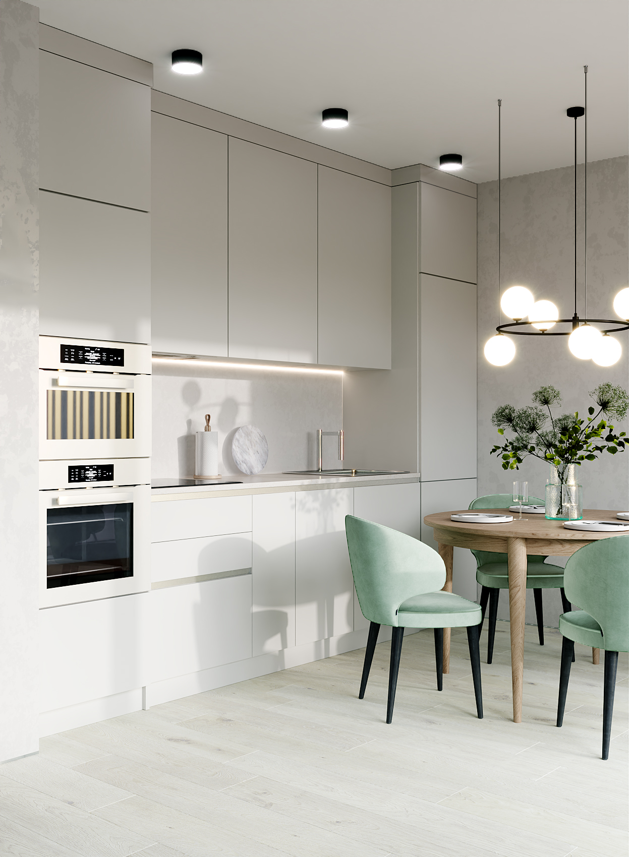 Нейтральные оттенки сочетаются с четкими и строгими графитовыми акцентами в освещении, сантехнике и мебельной фурнитуре и подчеркнуть небольшими цветовыми акцентами. Из зоны кухни есть выход на открытую квадратную террасу для отдыха.