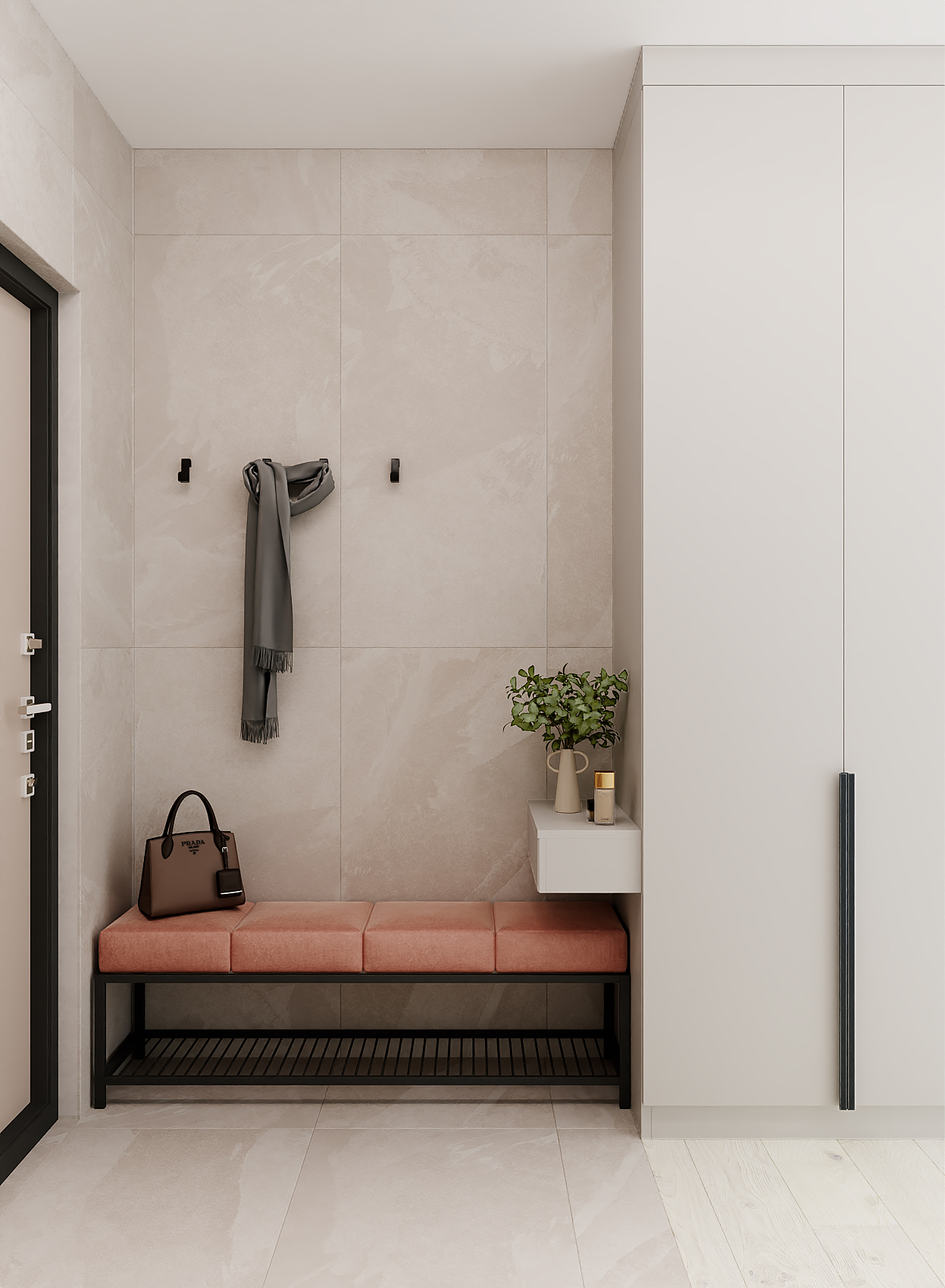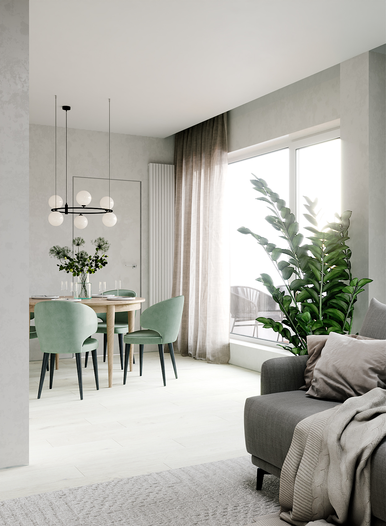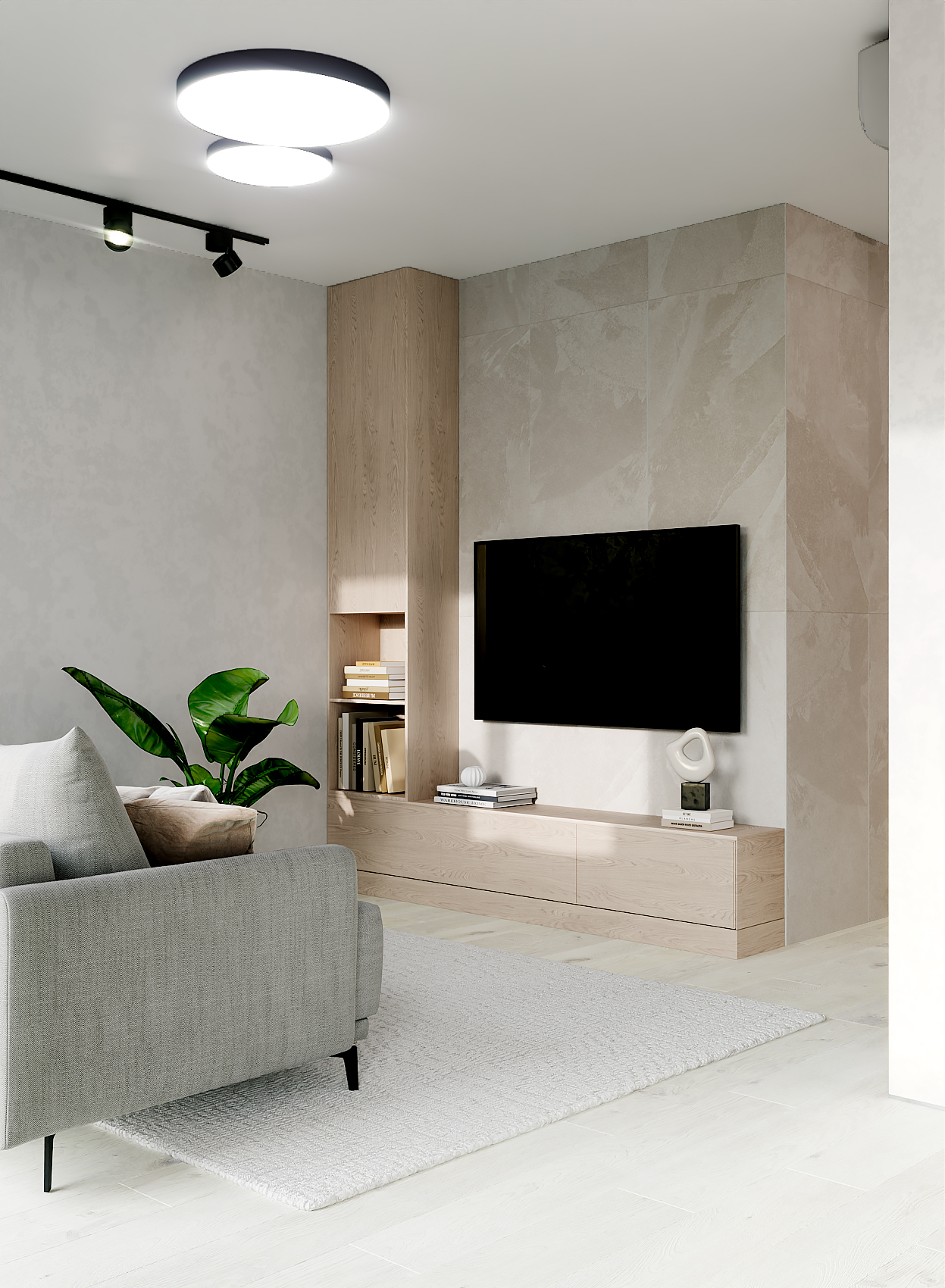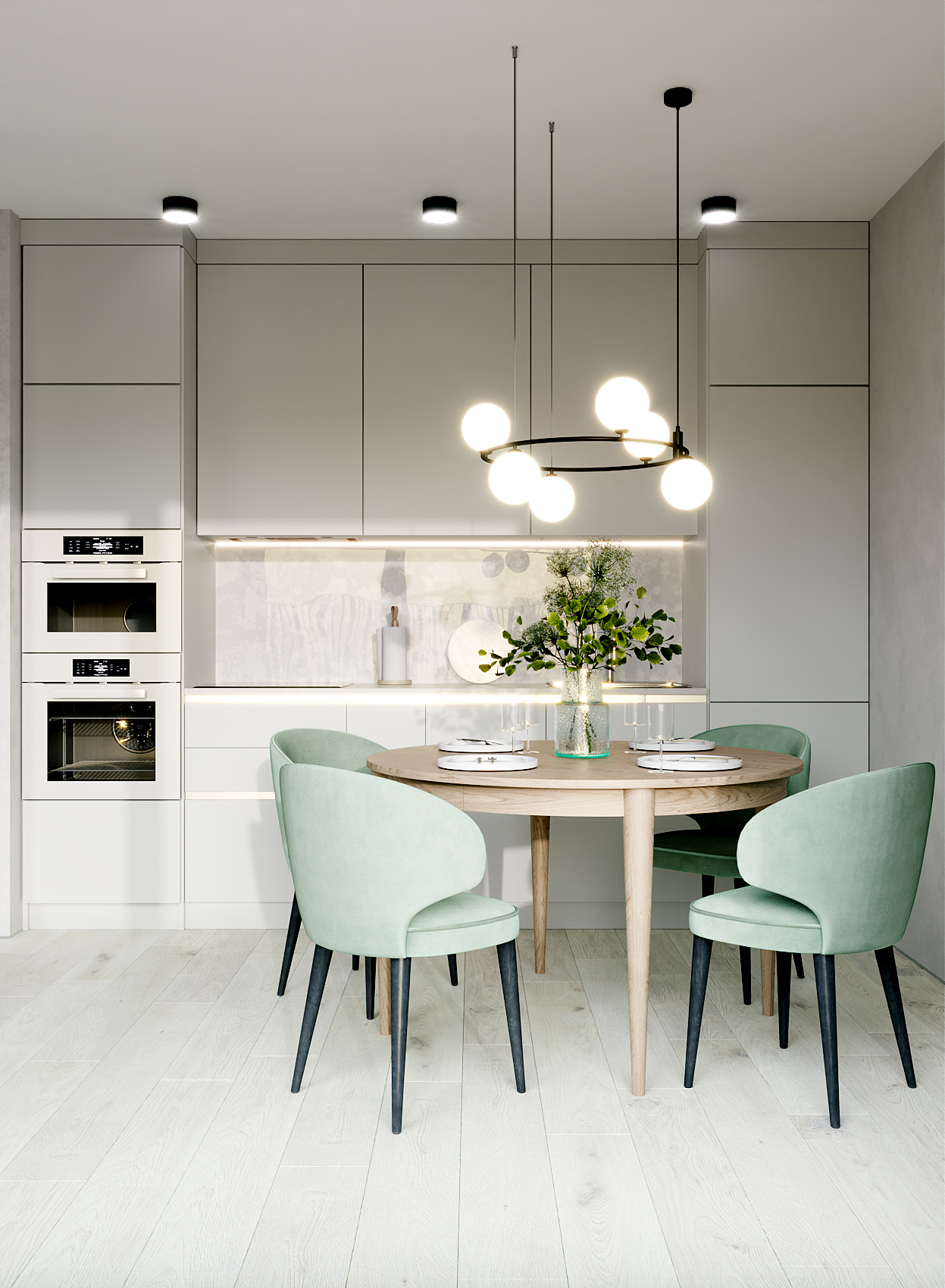 Нейтральные оттенки сочетаются с четкими и строгими графитовыми акцентами в освещении, сантехнике и мебельной фурнитуре и подчеркнуть небольшими цветовыми акцентами. Из зоны кухни есть выход на открытую квадратную террасу для отдыха.