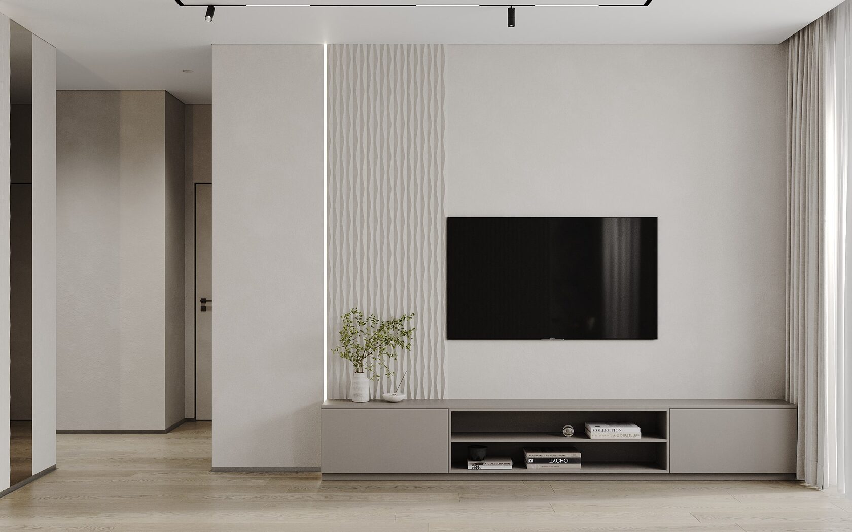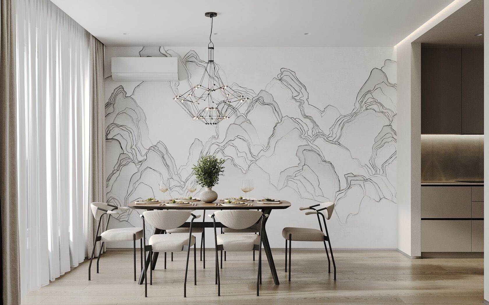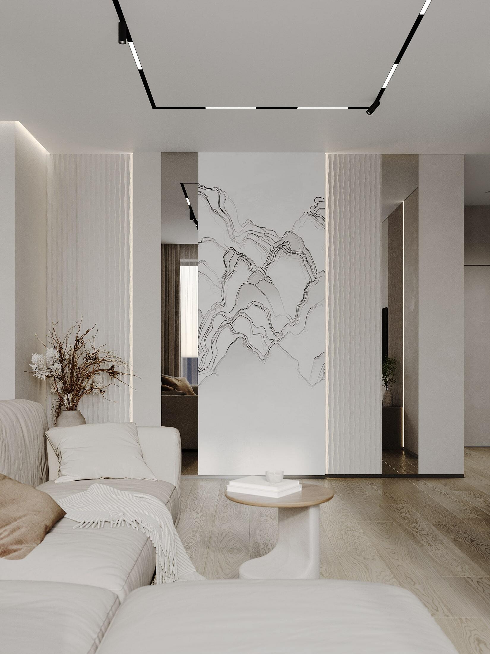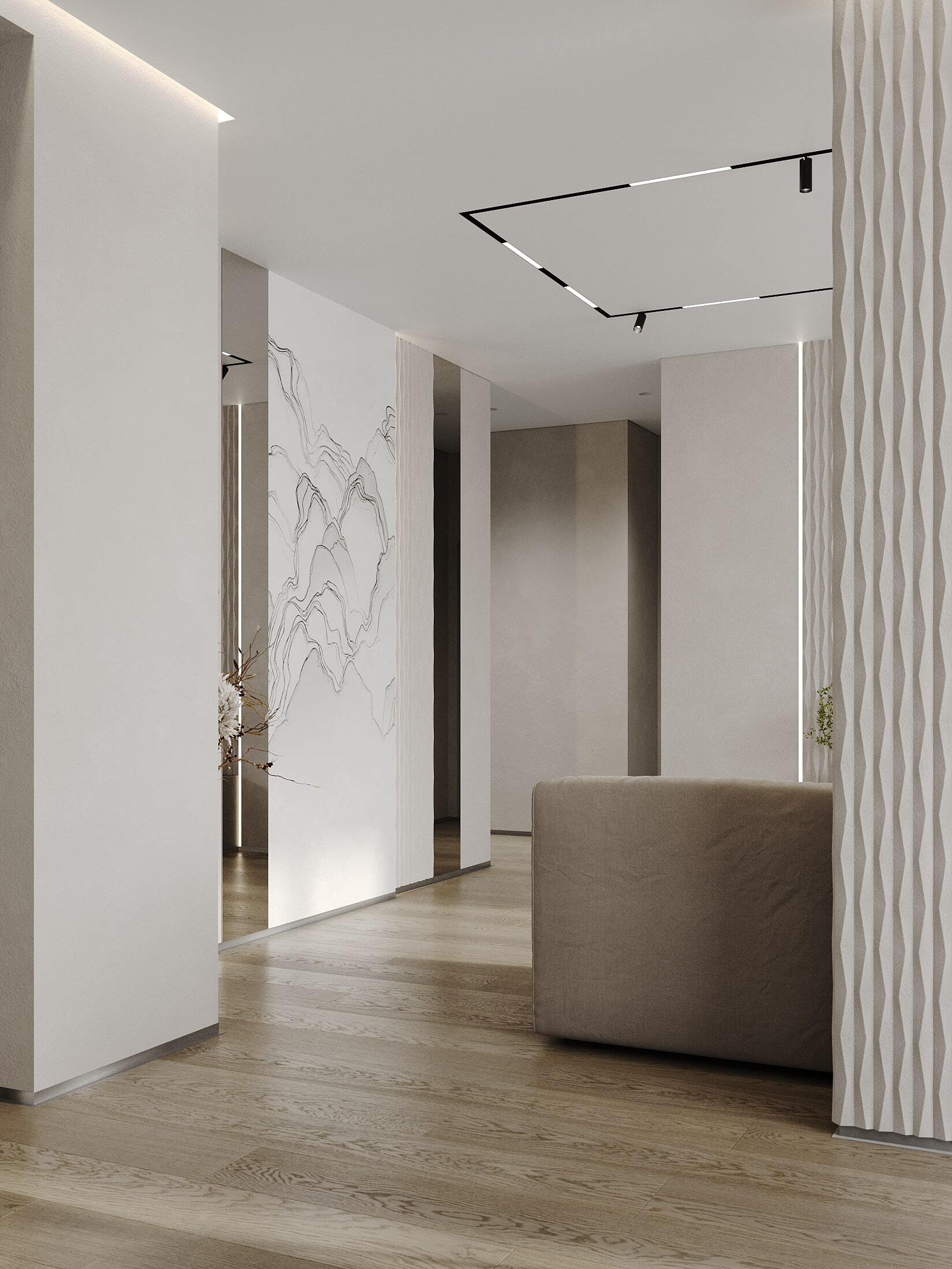 Светлое пространство, подчеркнутое изящными панелями, тонированным стеклом и панно с изящным рисунком.