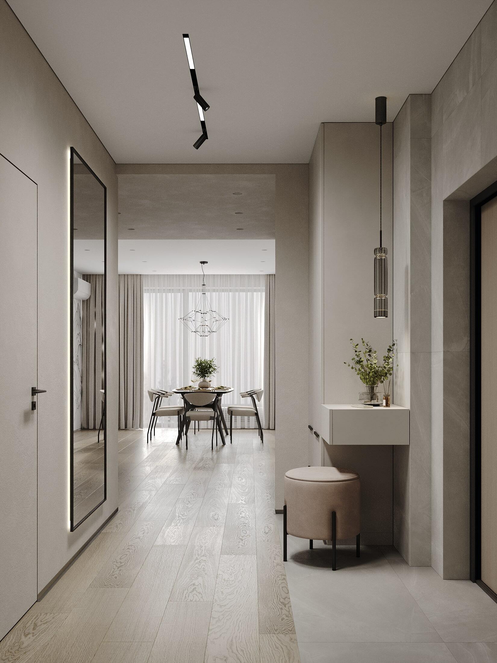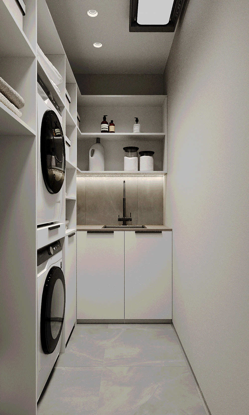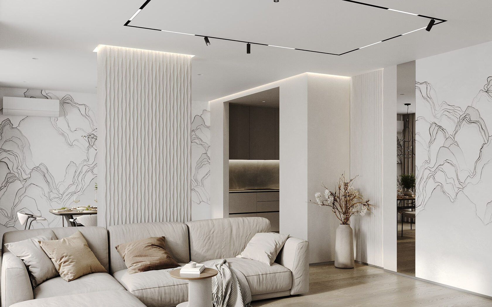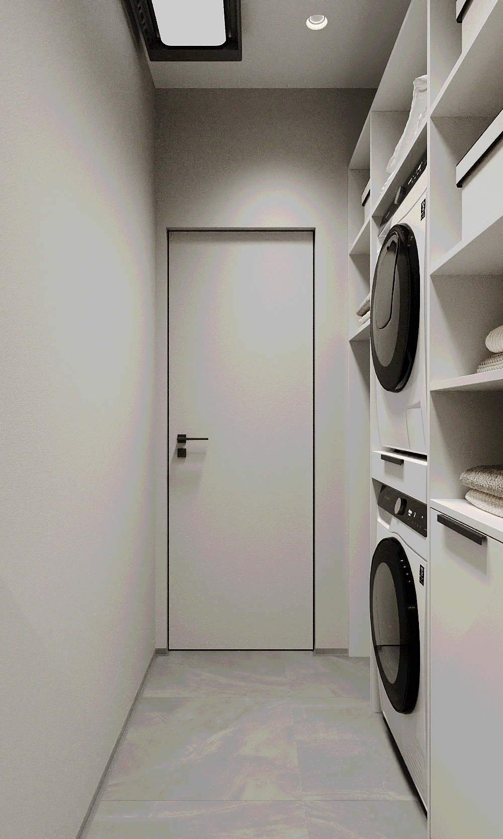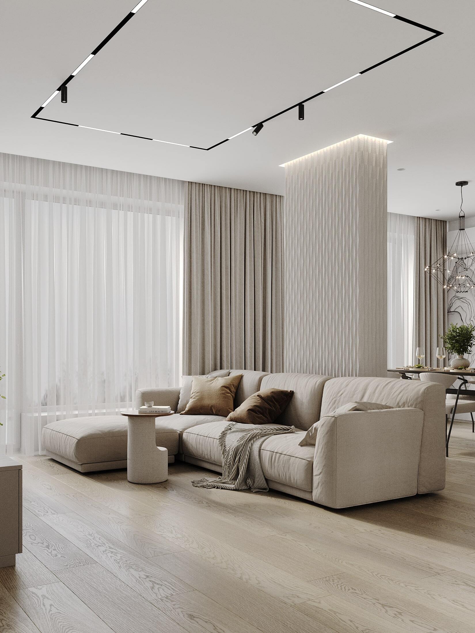 Просторная кухня-гостиная, с удачно вписанной в пространство несущей колонной, кухня, замкнутая в нишах и выделенная опуском потолка, отдельная столовая зона с акцентным светильником, большой вместительный диван для всех членов семьи. 2 санузла и отдельная постирочная.