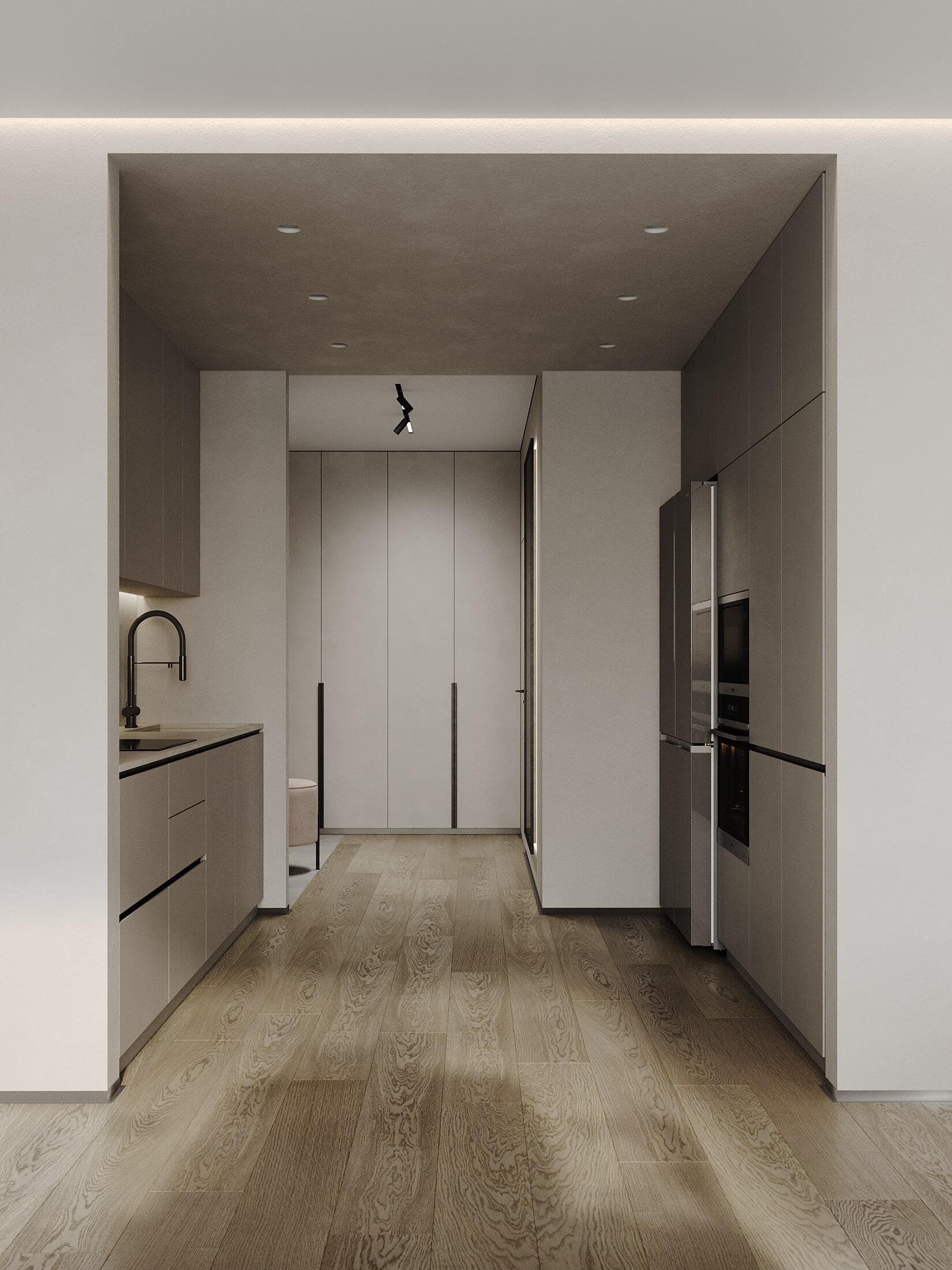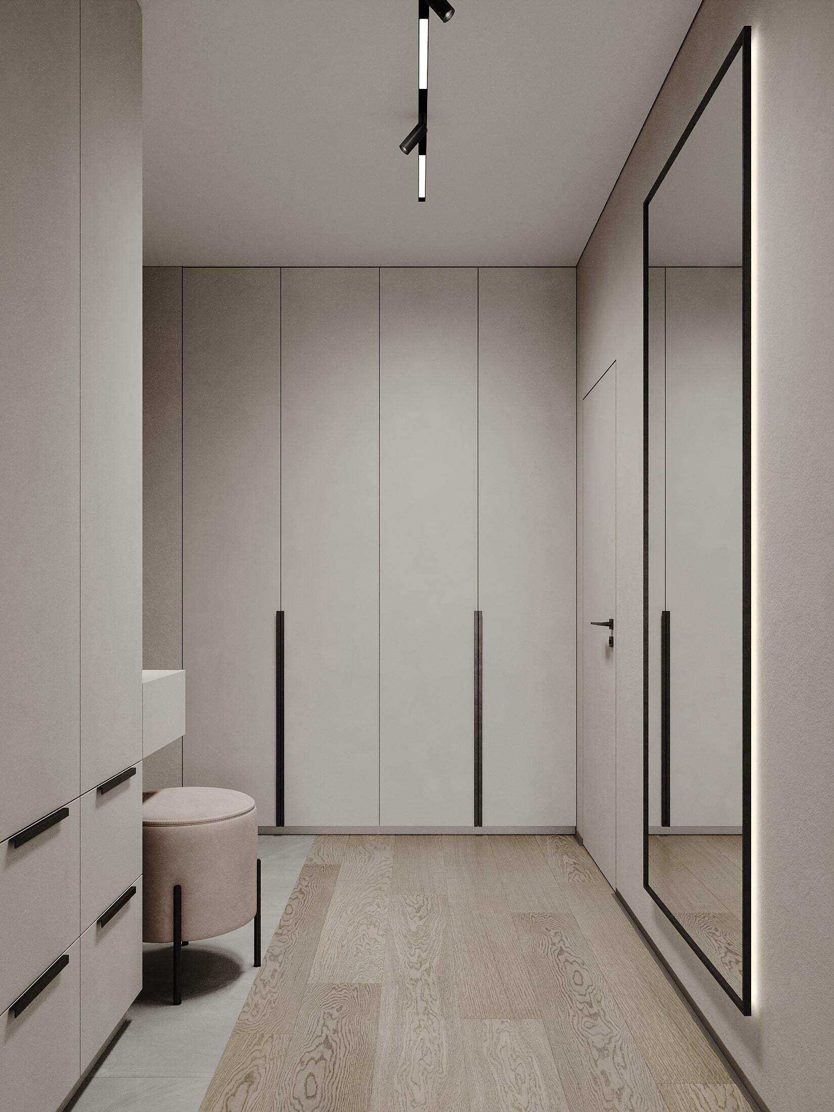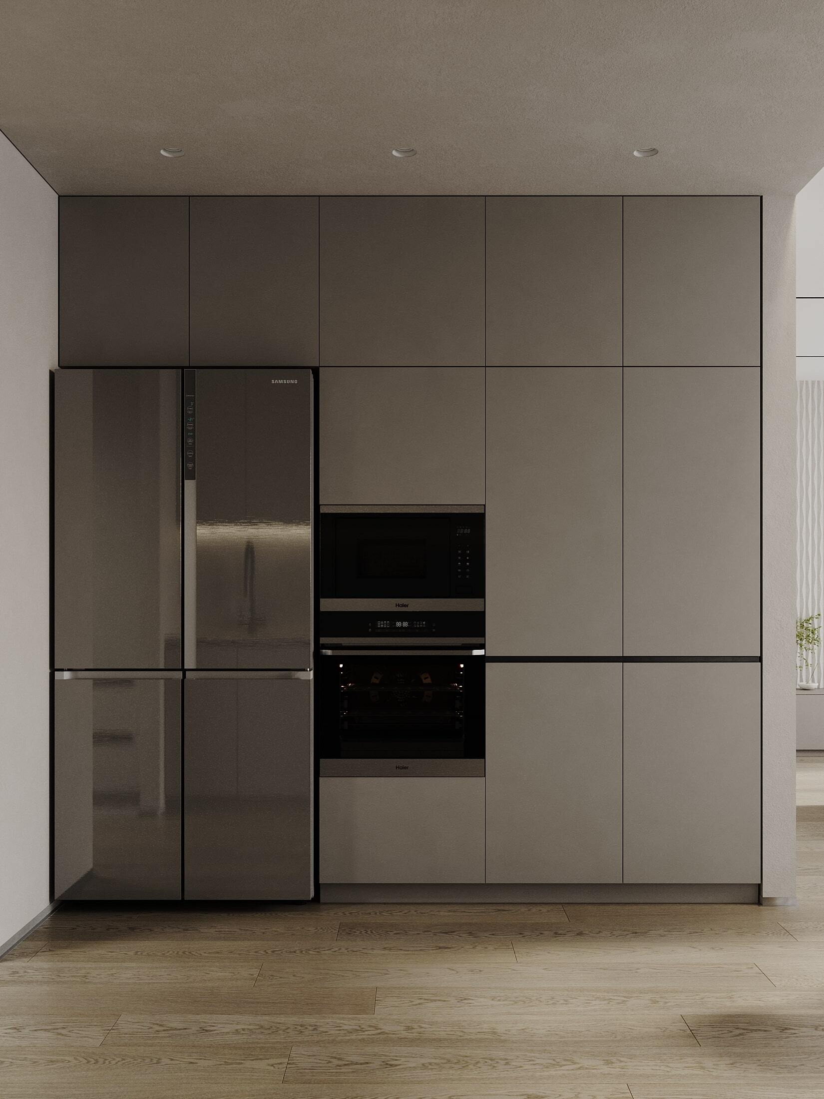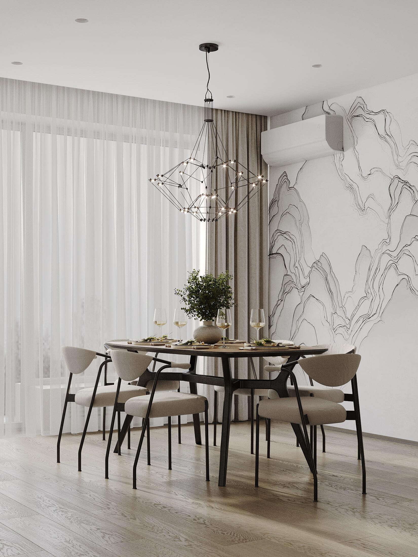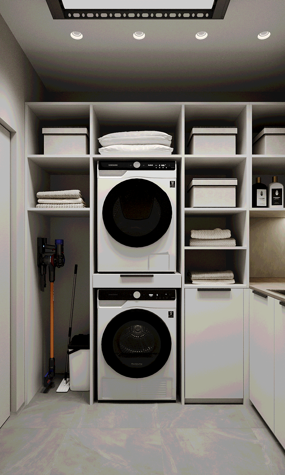 Просторная кухня-гостиная, с удачно вписанной в пространство несущей колонной, кухня, замкнутая в нишах и выделенная опуском потолка, отдельная столовая зона с акцентным светильником, большой вместительный диван для всех членов семьи. 2 санузла и отдельная постирочная.