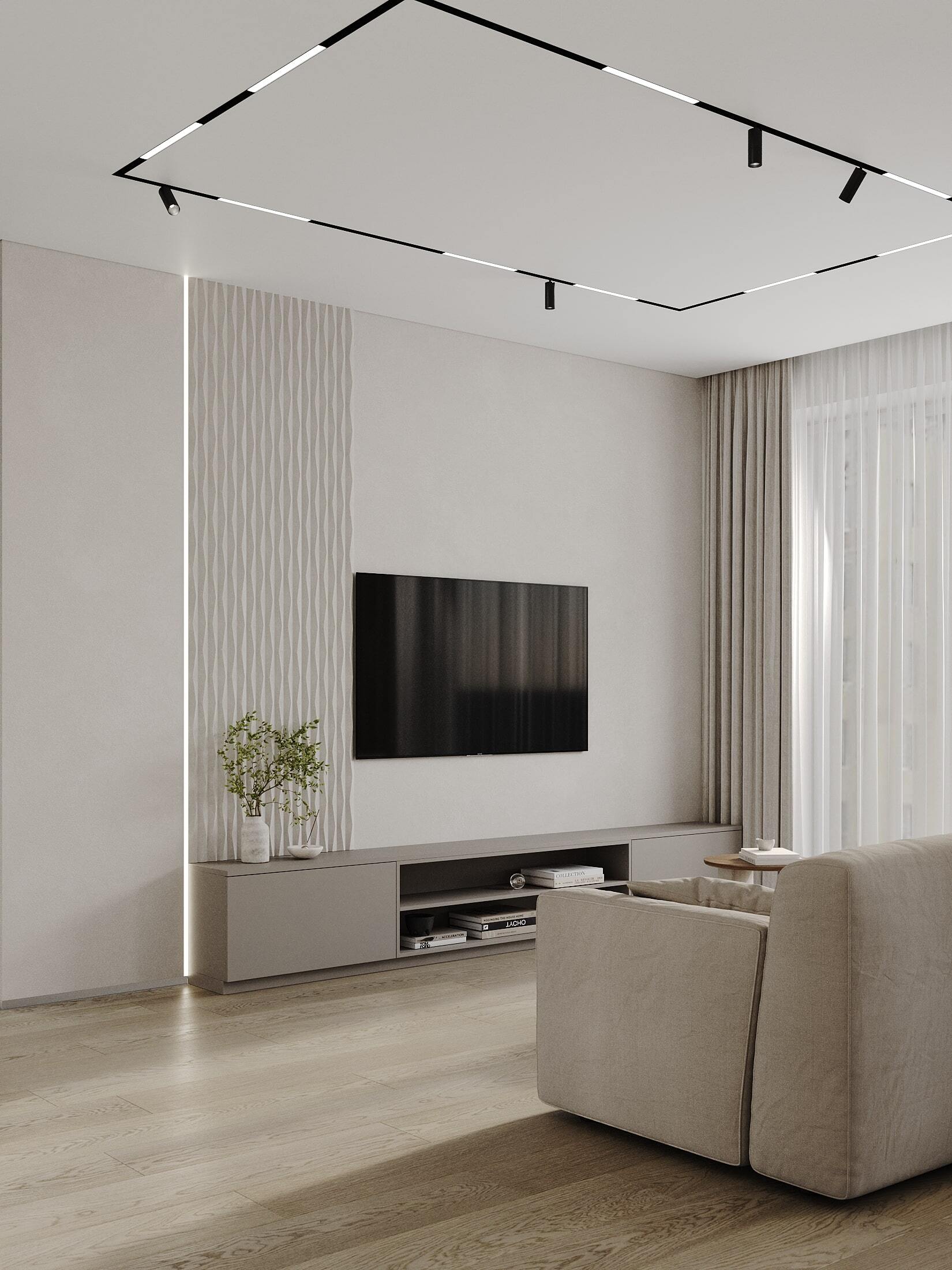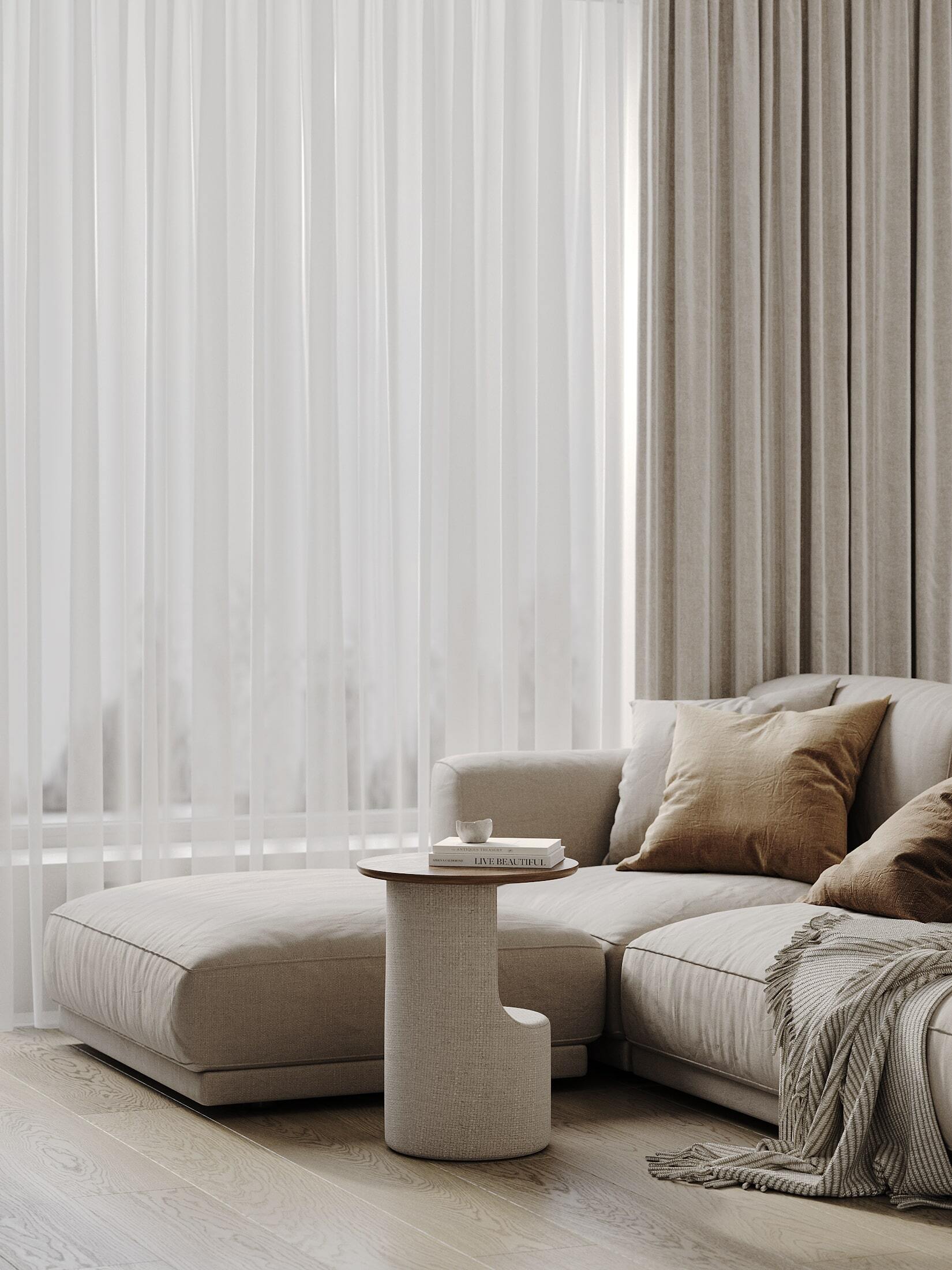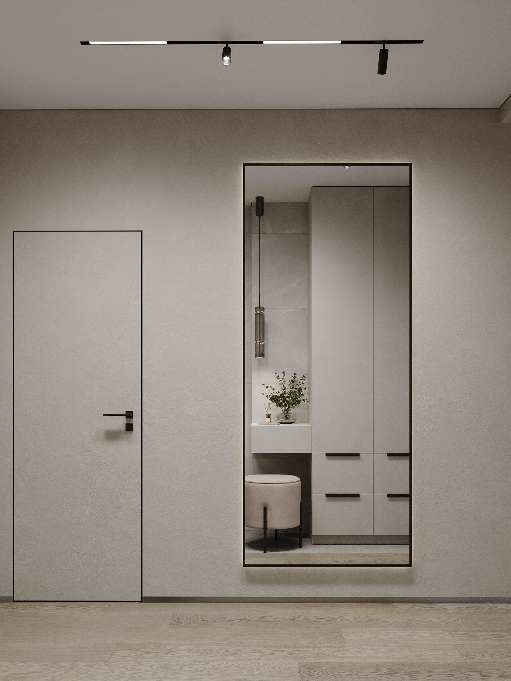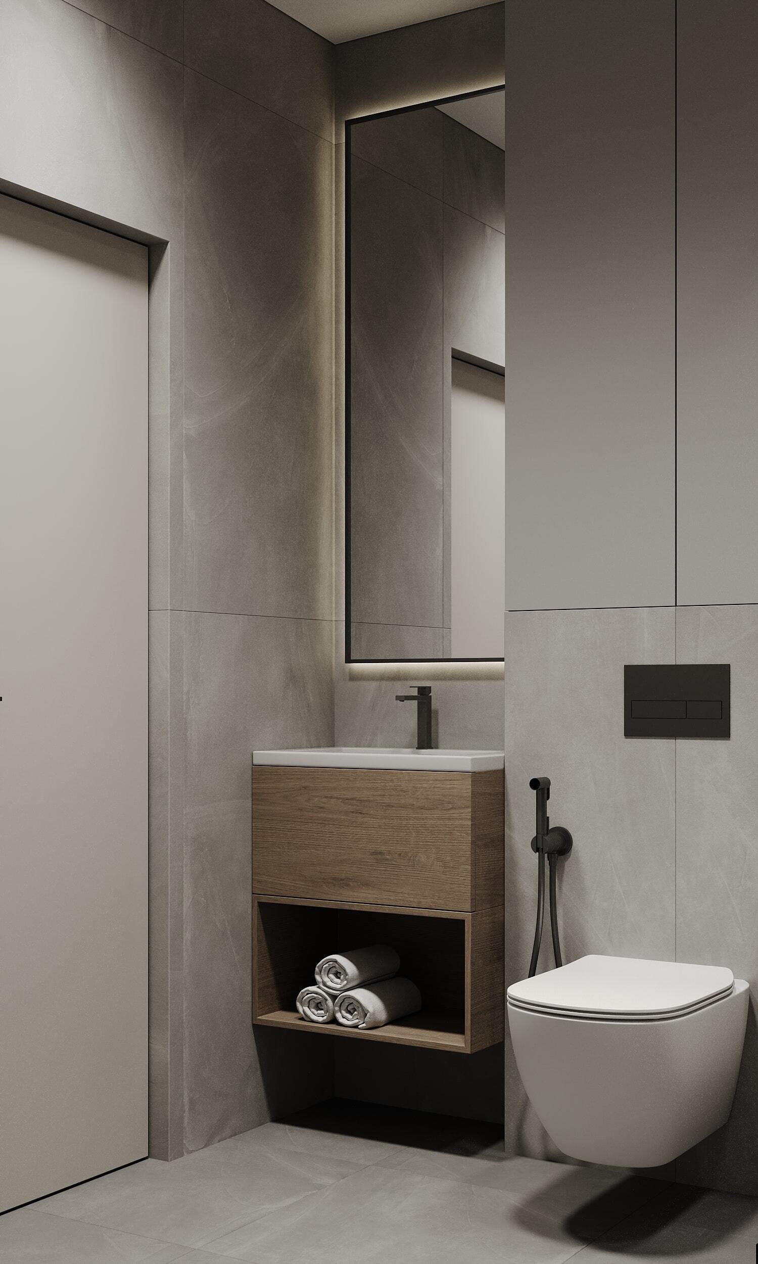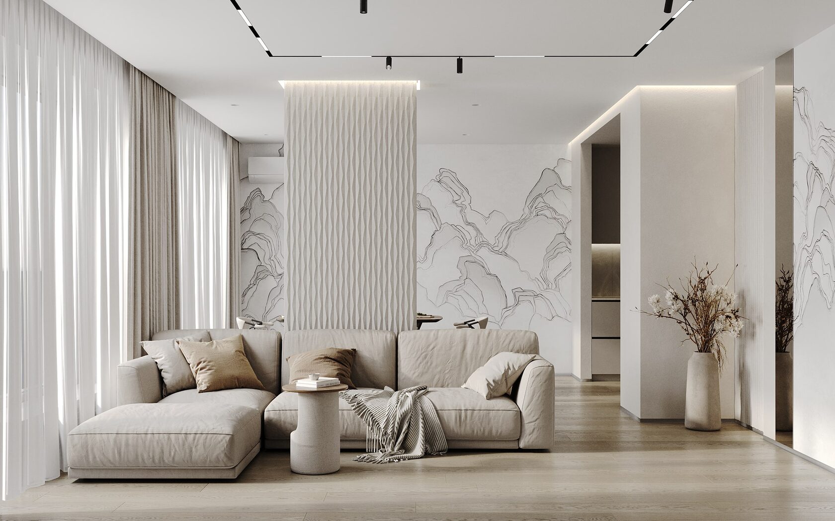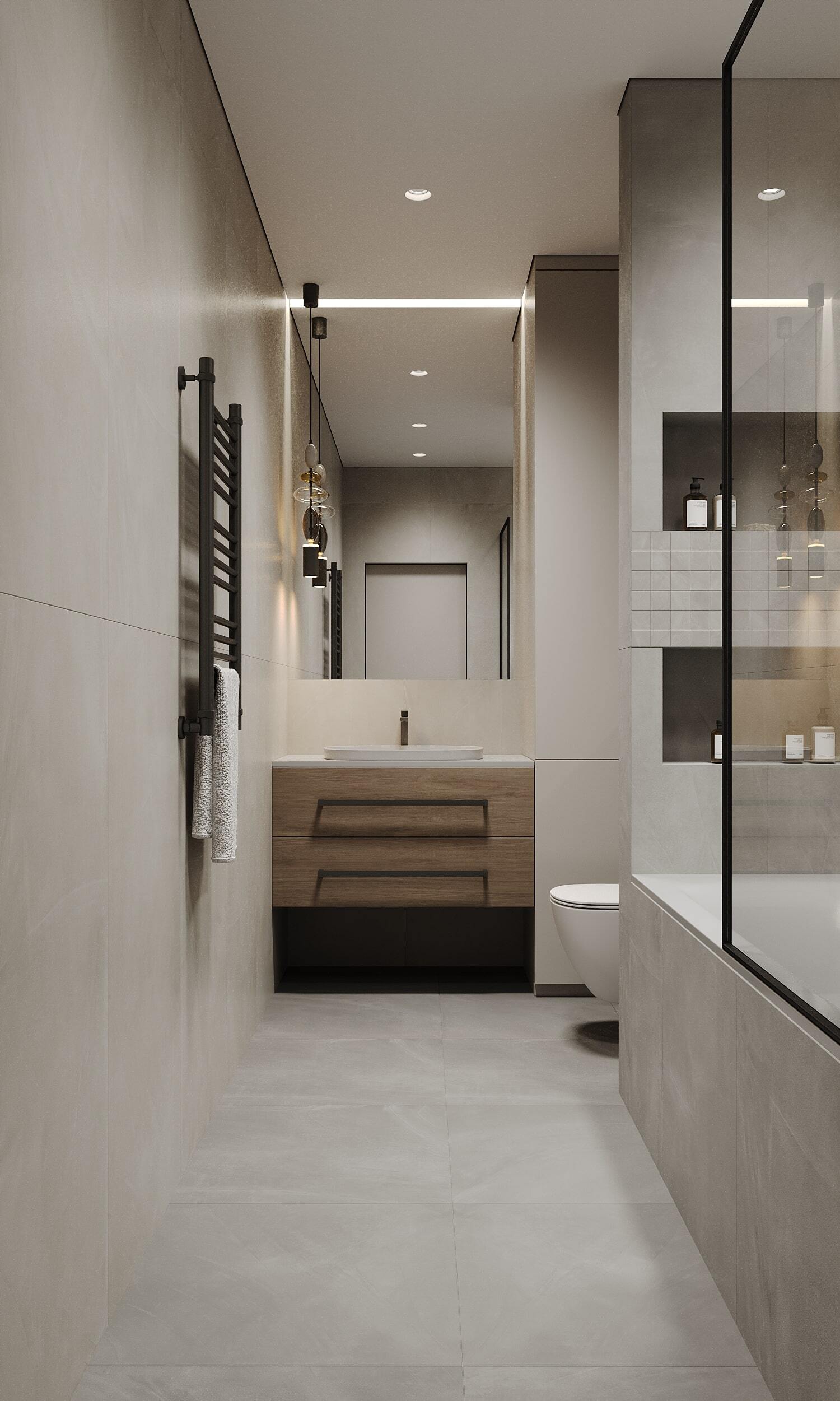 Просторная кухня-гостиная, с удачно вписанной в пространство несущей колонной, кухня, замкнутая в нишах и выделенная опуском потолка, отдельная столовая зона с акцентным светильником, большой вместительный диван для всех членов семьи. 2 санузла и отдельная постирочная.