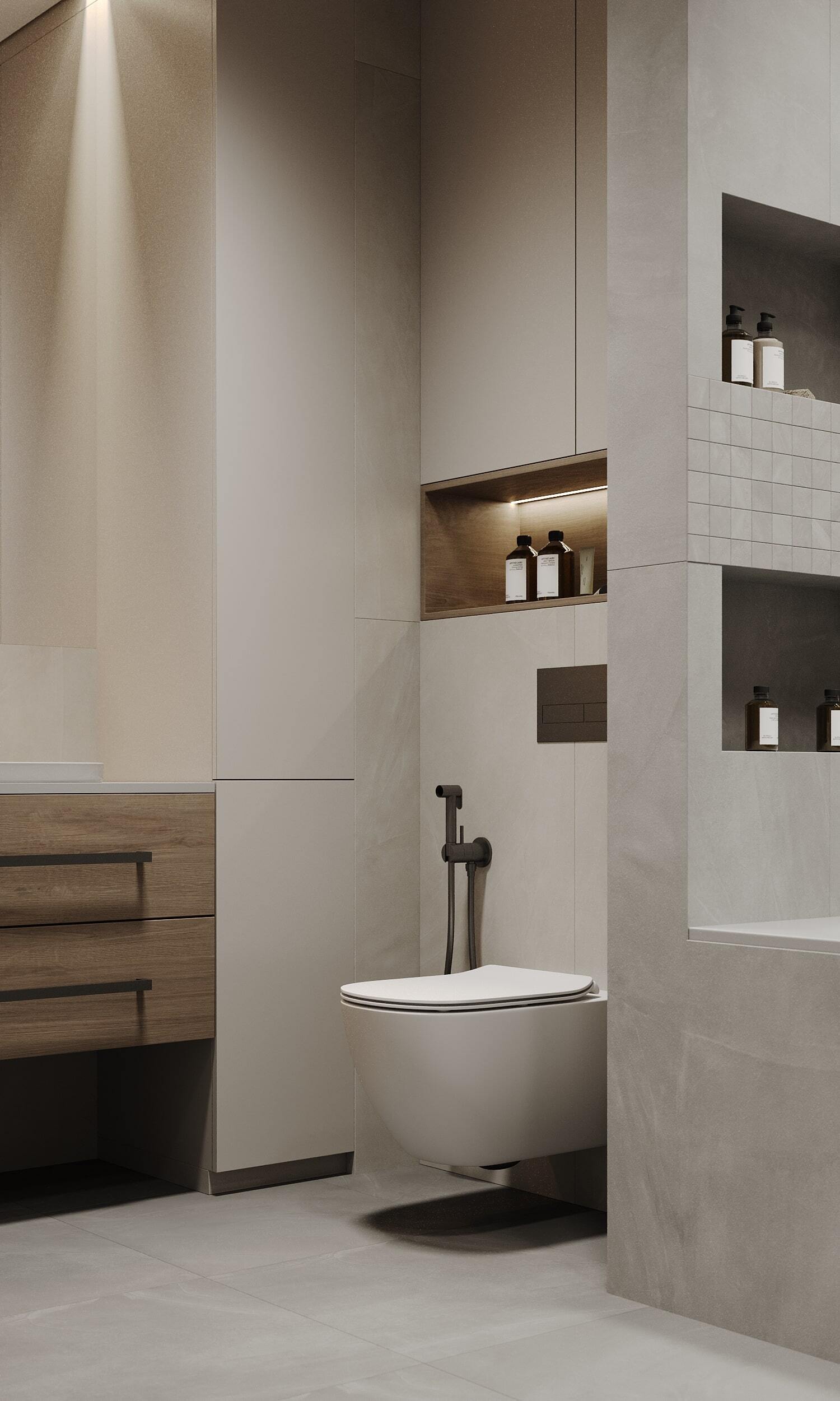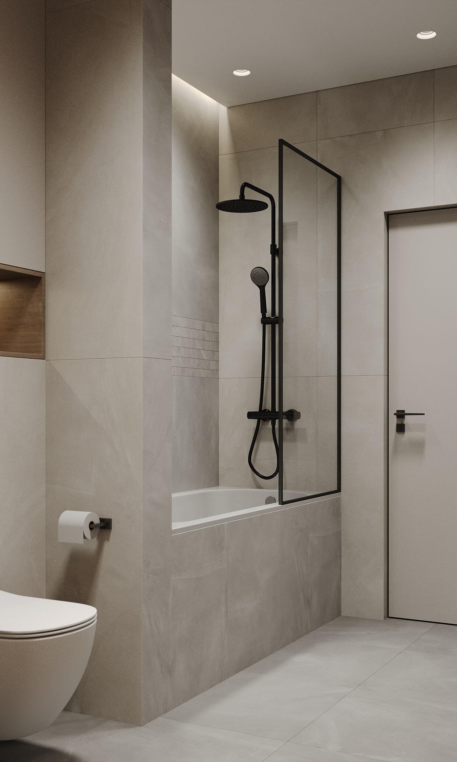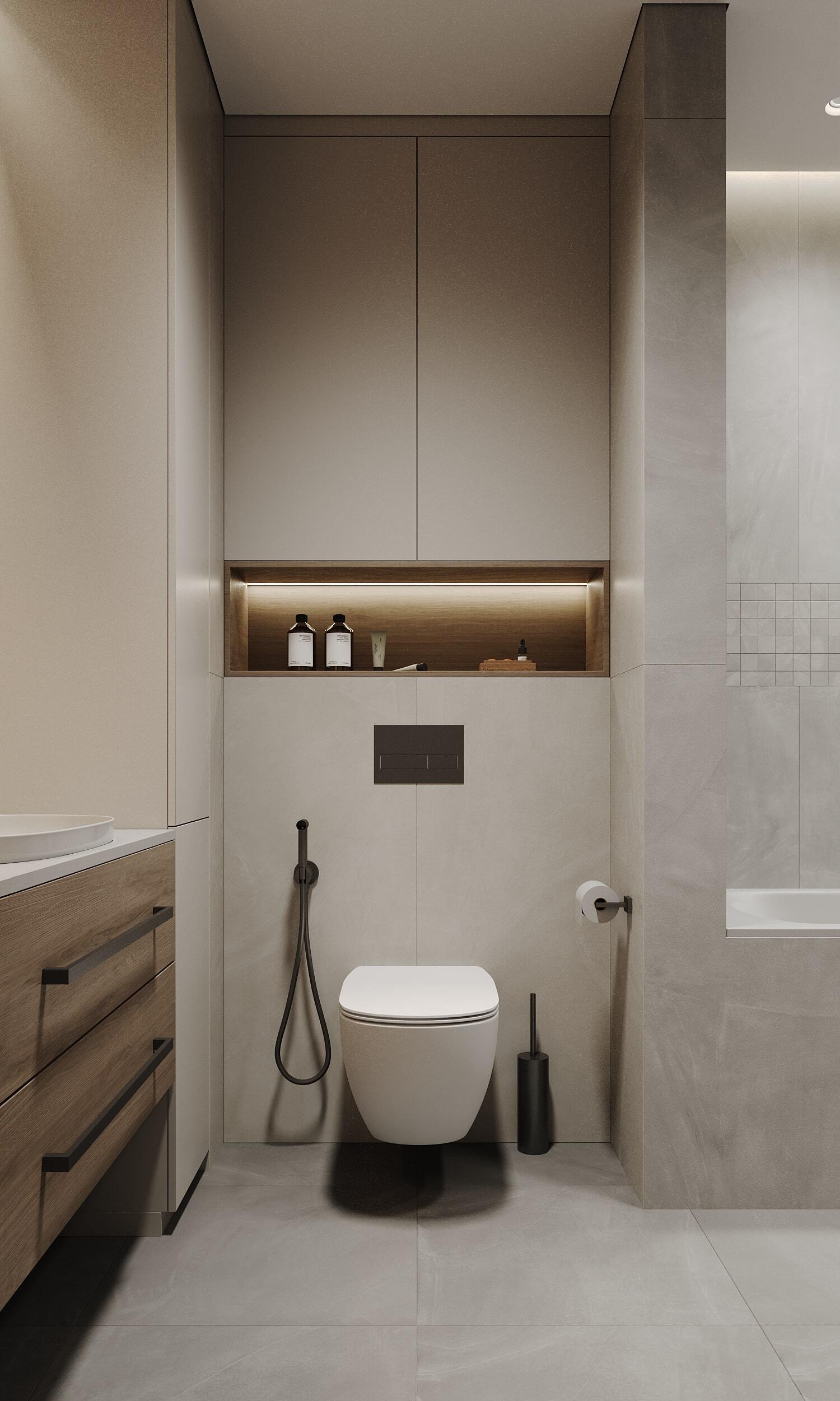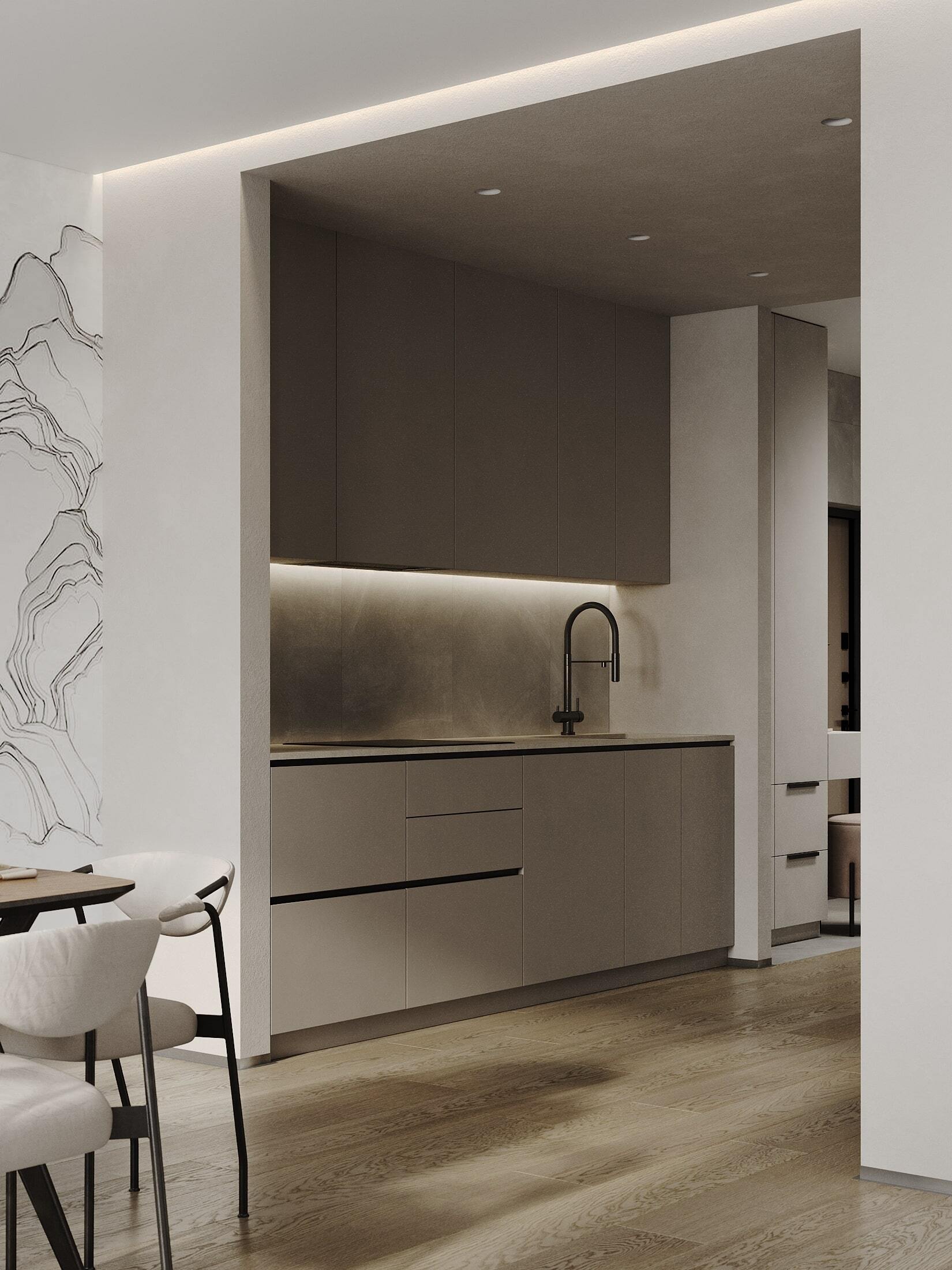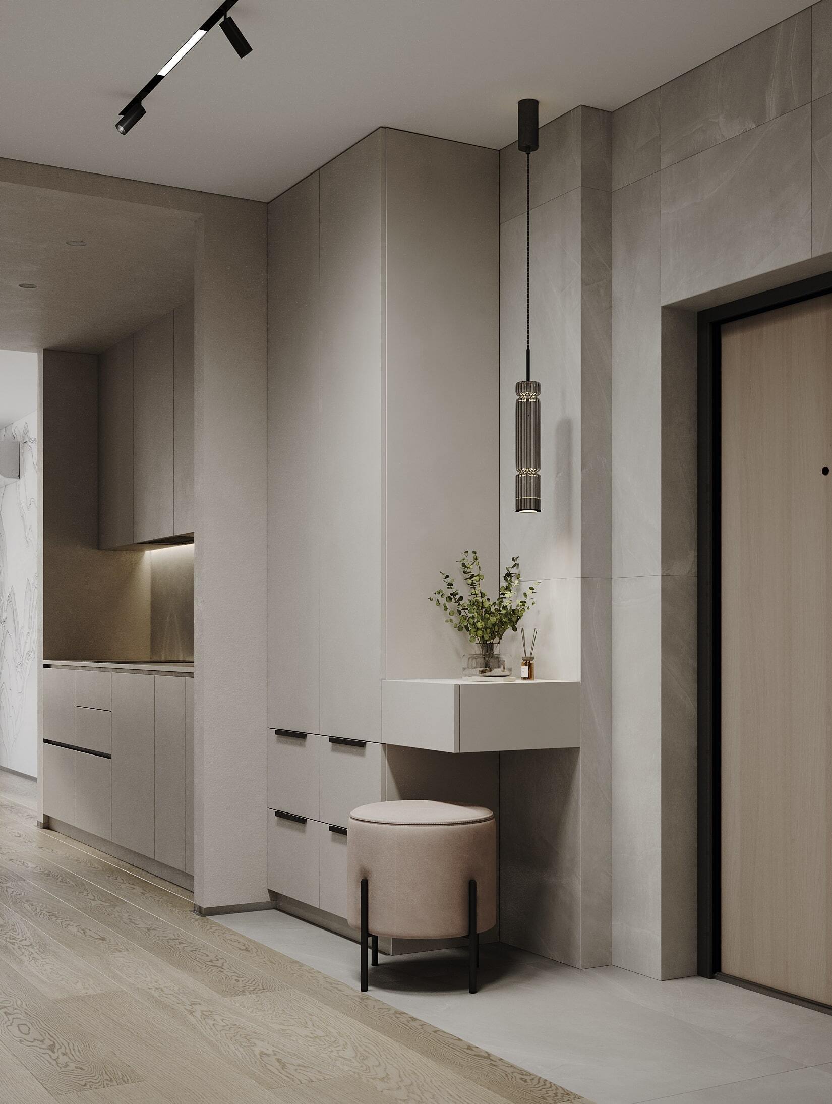 Просторная кухня-гостиная, с удачно вписанной в пространство несущей колонной, кухня, замкнутая в нишах и выделенная опуском потолка, отдельная столовая зона с акцентным светильником, большой вместительный диван для всех членов семьи. 2 санузла и отдельная постирочная.