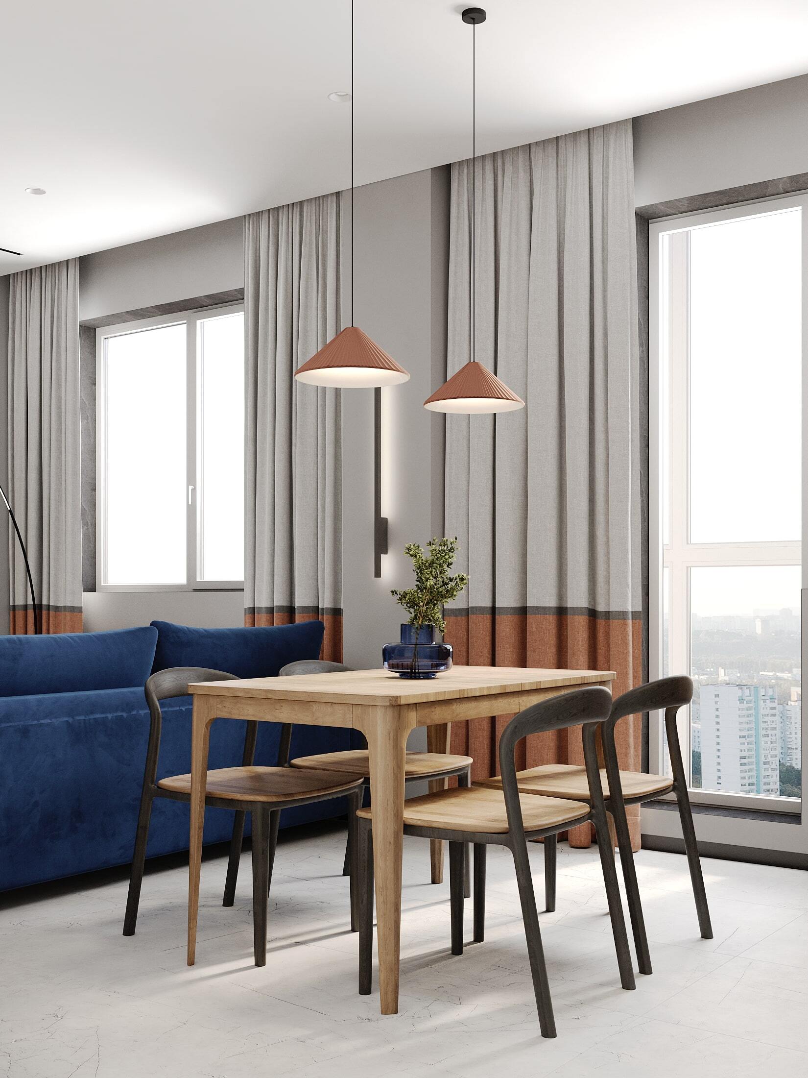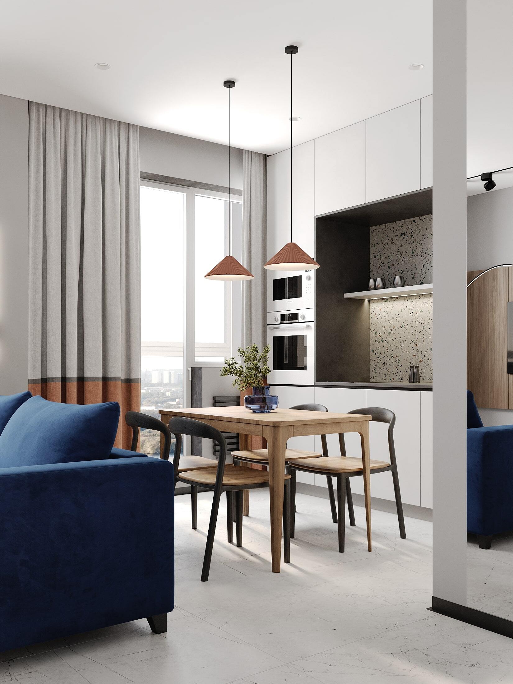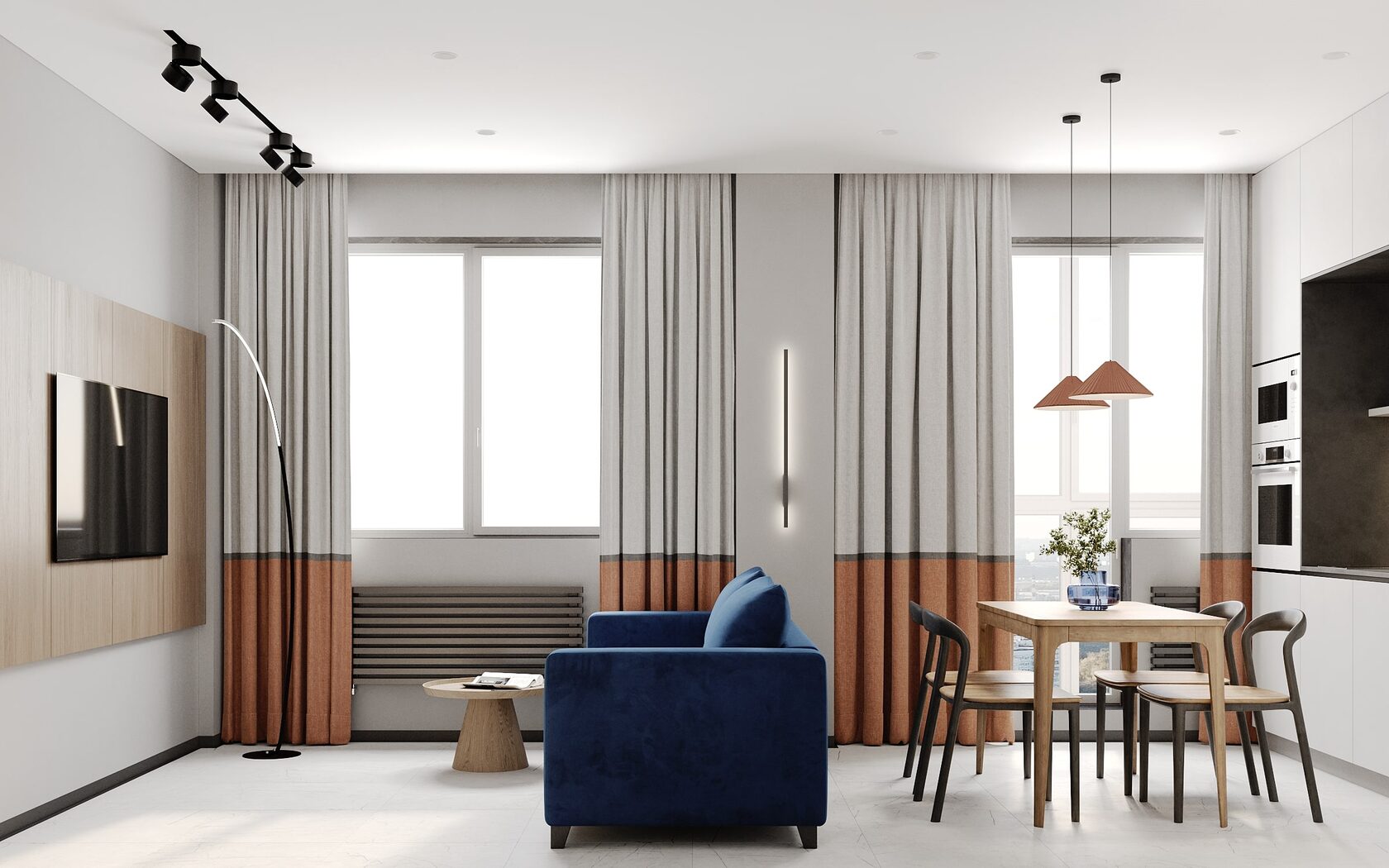 Единое пространство с удобным зонированием на кухню, гостиную, спальню и прихожую. Интерьер, настраивающий на позитив, которого порой так не хватает.