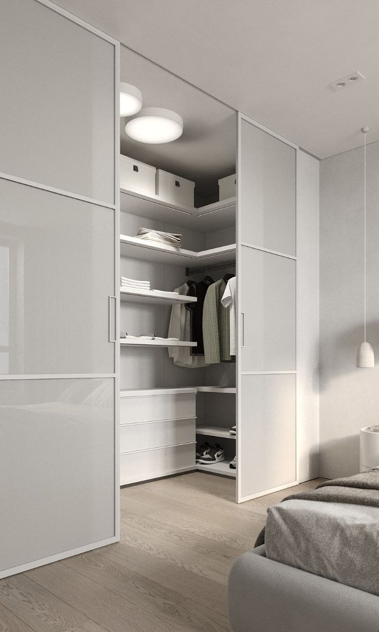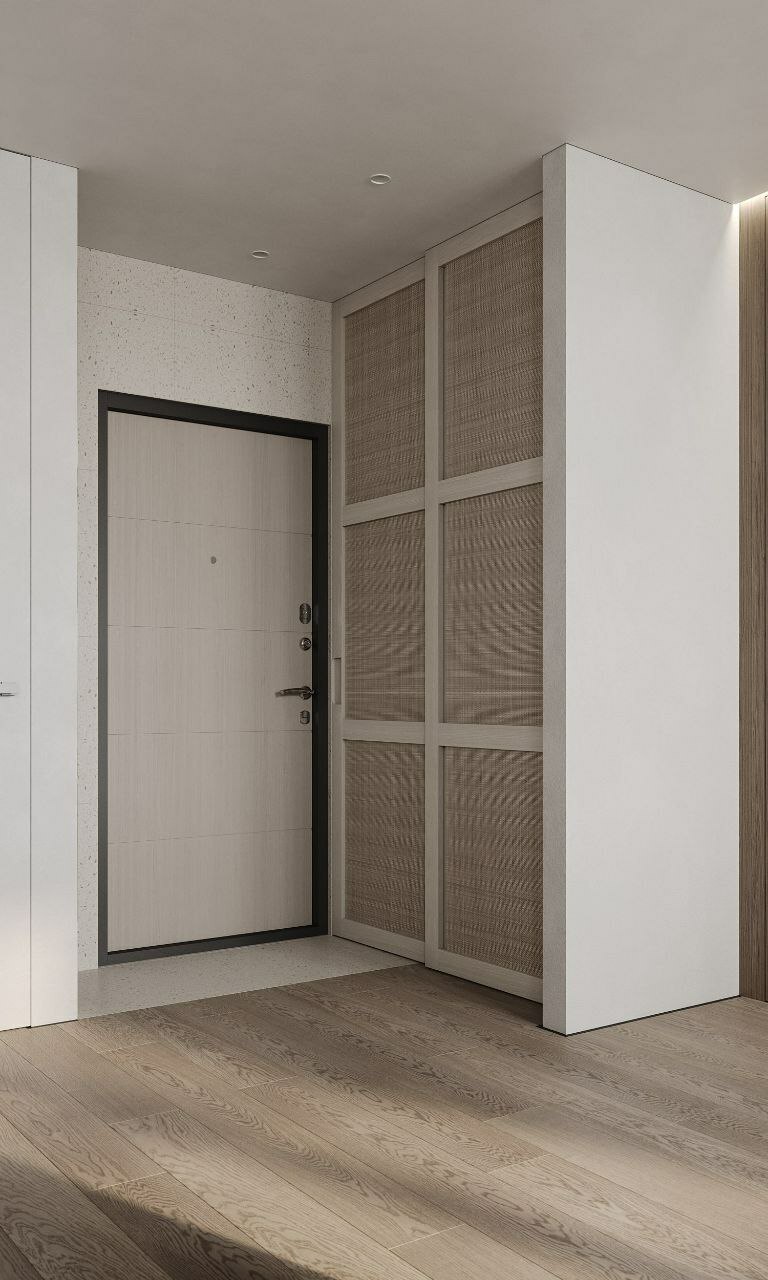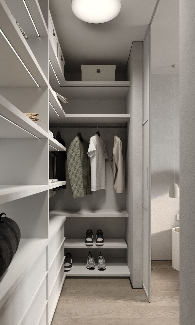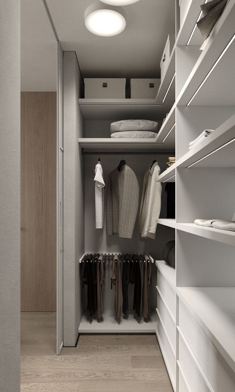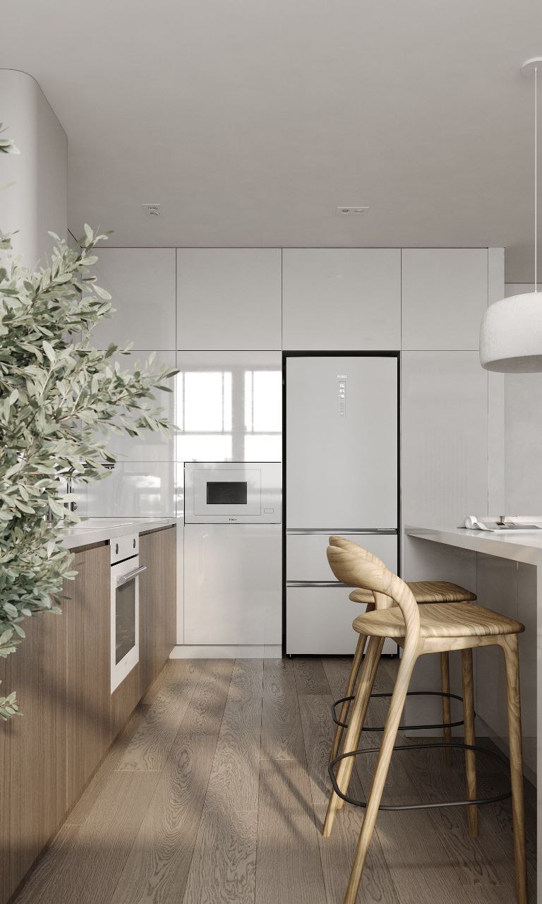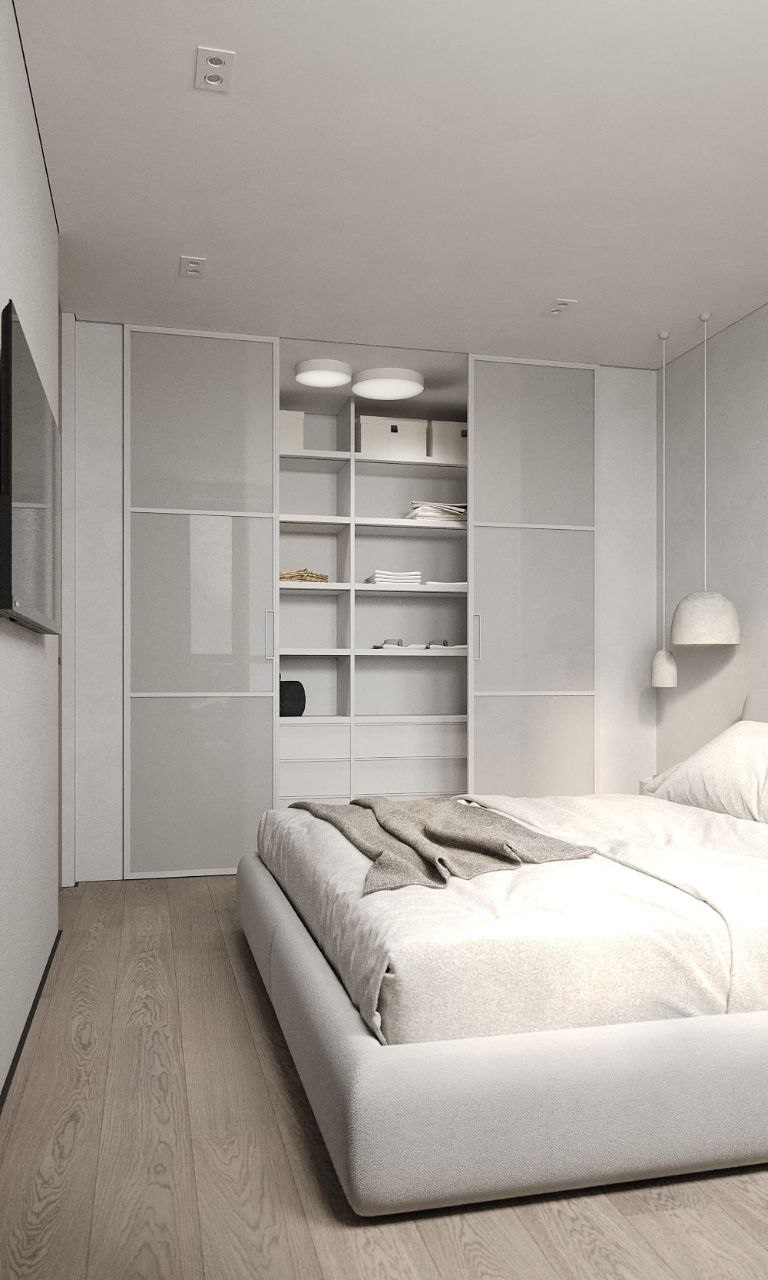 Просторная кухня-гостиная с минимумом деталей, сочетание глянцевых и матовых поверхностей, нейтральные, приятные тона. Нестандартное спальное место 2х2 метра для ежедневного комфорта, продуманная под заказчика гардеробная. Небольшой, но продуманный для мелочей санузел. Всё, что нужно, чтобы отдохнуть от шума большого города в своих апартаментах.